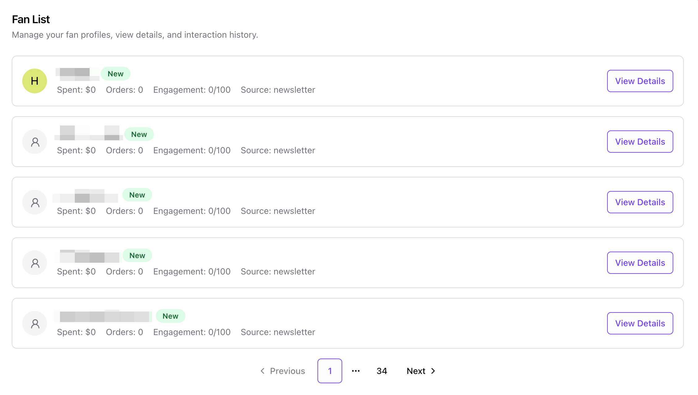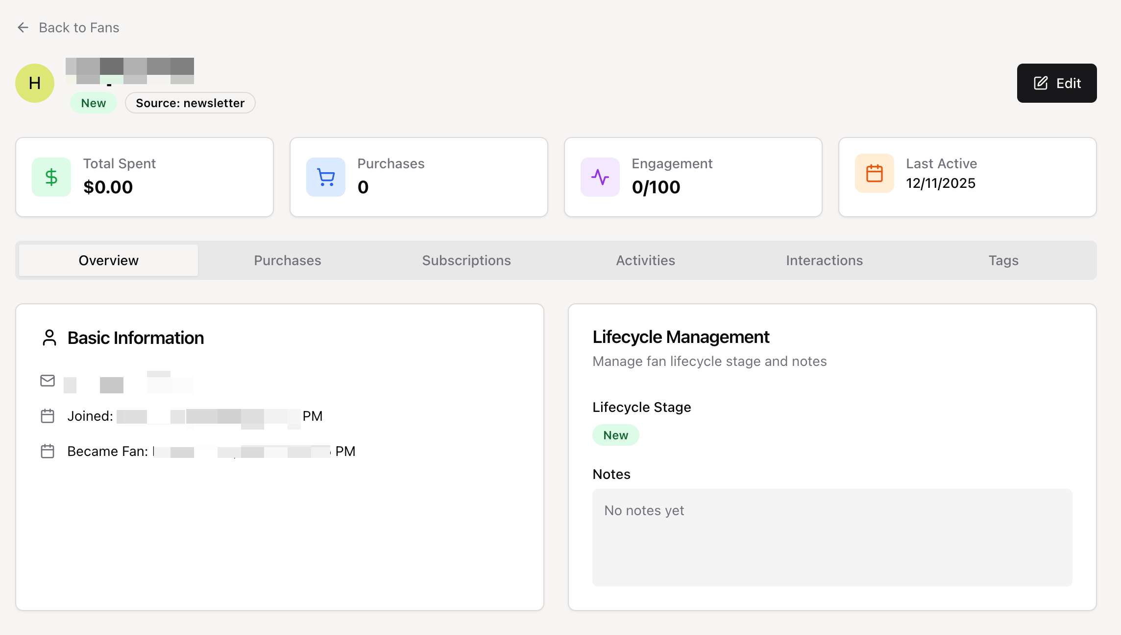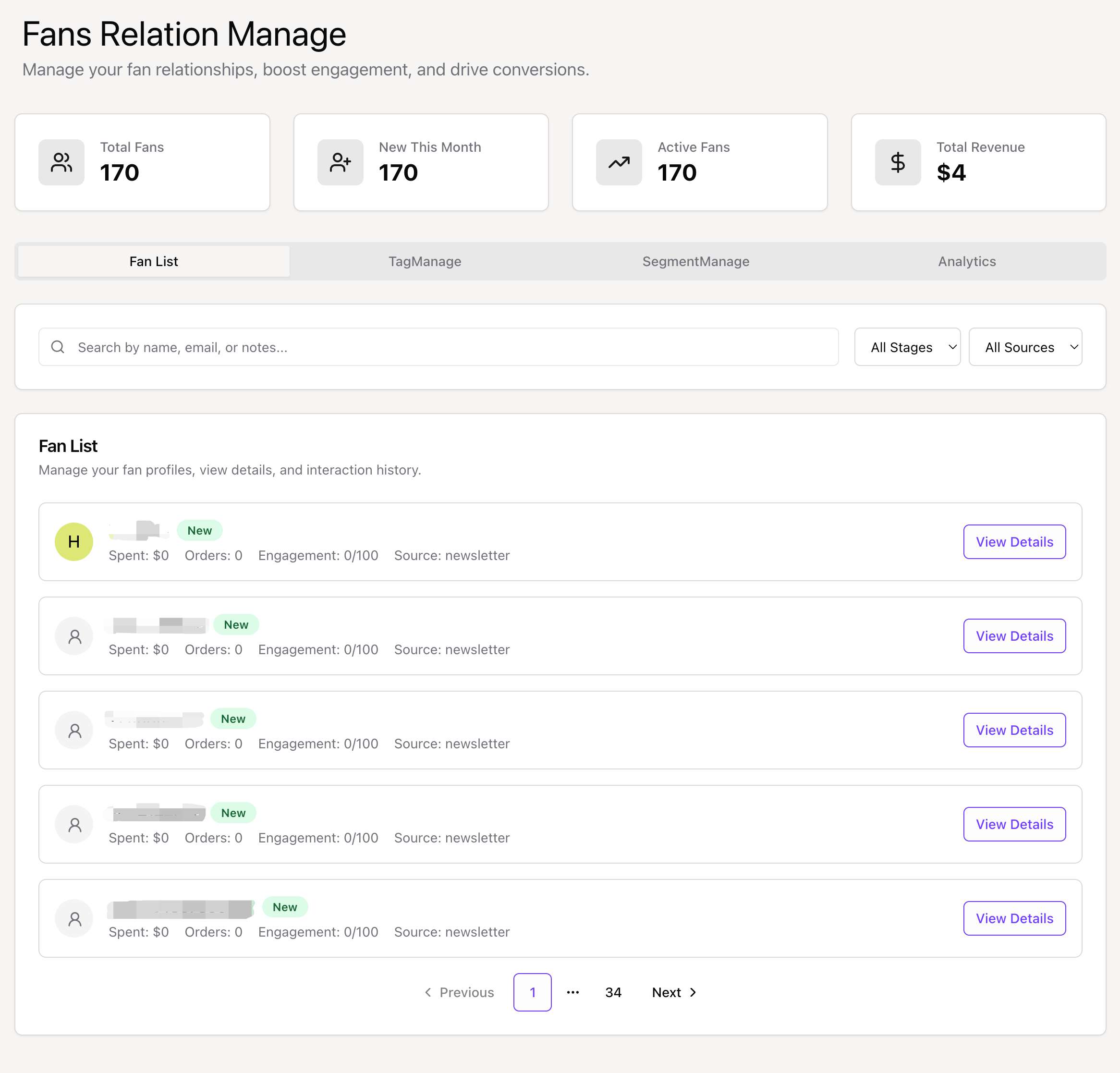 - Stage Filter: Filter fans by their lifecycle stage (New, Engaged, Customer, Advocate, Inactive).