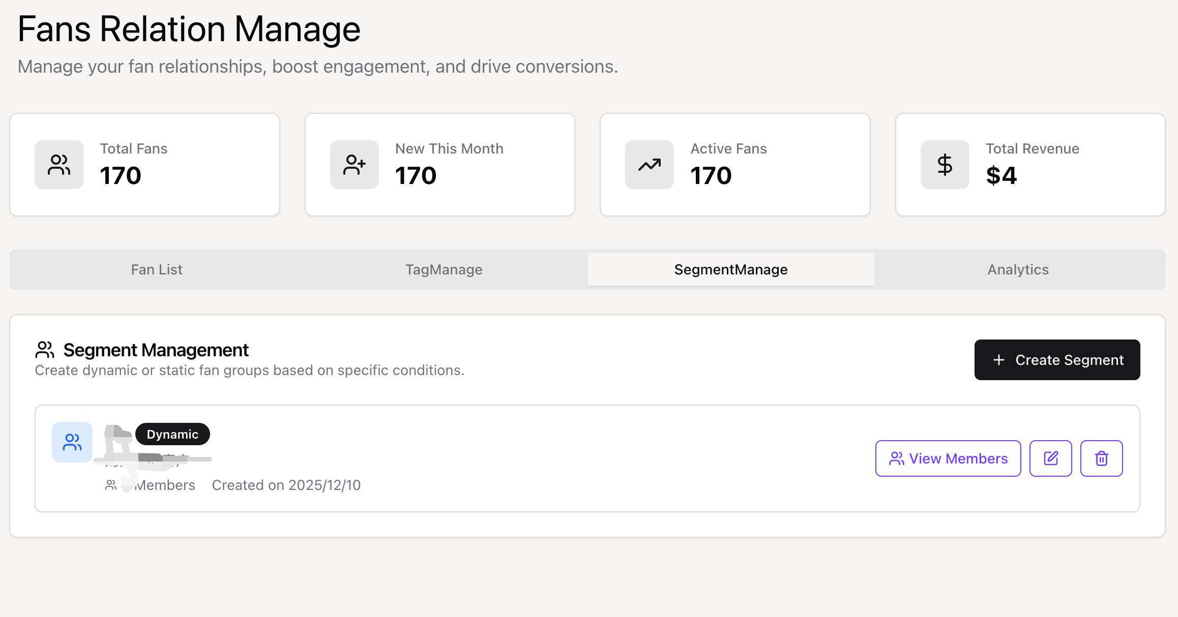 The "Segment Management" tab allows you to group fans based on shared characteristics. This is powerful for targeted messaging.